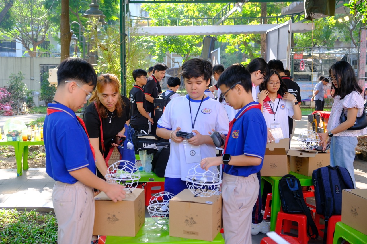 (Học sinh tự chuẩn bị thiết bị và kiểm tra kỹ lưỡng trước trận đấu Drone Soccer)